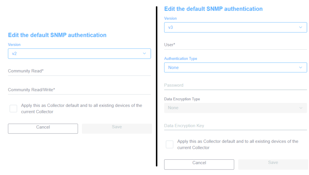 Once clicked, select the SNMP version and enter the appropriate credentials. For SNMPv1/v2, enter the Community Read and Community Read/Write strings. For SNMPv3, enter the User and Password along with the desired Authentication Type and Data Encryption settings.