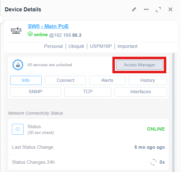 From the Collector Devices section, select one of your devices (such as a switch) and select the Access Manager button.