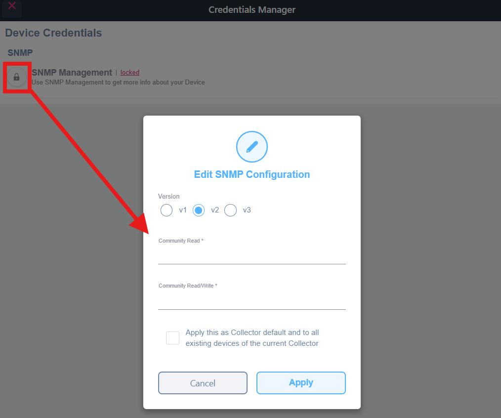 This will open the Credentials Manager. At the SNMP section, click on the lock icon to edit the SNMP version and credentials.