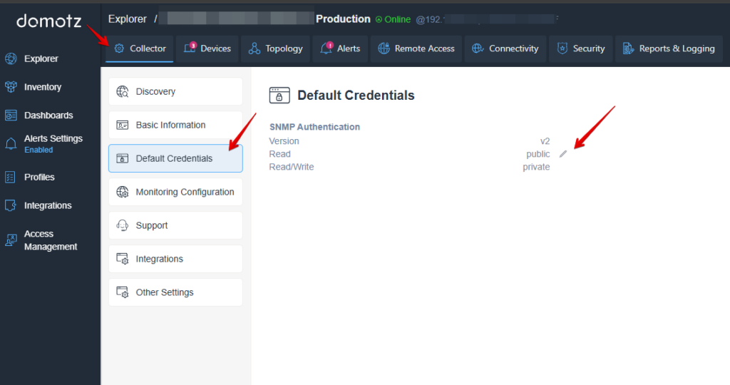 To set SNMP credentials globally for all devices on a collector (new discovered devices and current), navigate to Webapp > Explorer > Select the Collector > Collector menu > Default Credentials click on the pen icon to edit the default site SNMP settings.